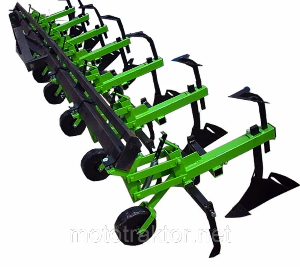 В комплект культиватора входит окучники и полольники, которые меняются местами в ручную по необходимости. По бокам каждого ряда установлены долота.