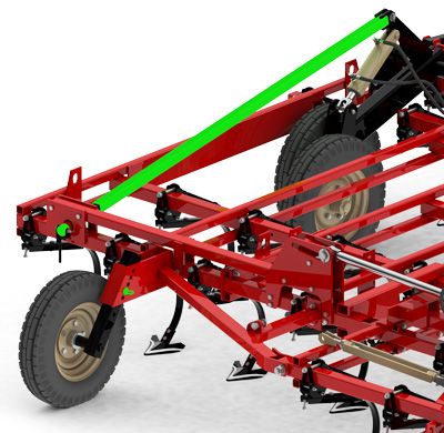 Рама мостовой конструкции культиватора КПС-8ПМУ обеспечивает высокую прочность и надежность, при этом сохраняя небольшой вес. Имея жесткую сцепку, конструкция культиватора обеспечивает параллельное поднятия и опускания агрегата относительно поверхности, которая обрабатывается, во время разворотов и переездов. Равномерность подъема культиватора относительно сцепки с трактором обеспечивает механизм, соединяющий дышло агрегата с его внутренними колесами. Равномерность подъема центральной части культиватора и его крыльев обеспечивается конструкцией гидроцилиндров колес и последовательной схеме подключение гидроцилиндров. Шаг расположения рабочих органов культиватора КПС-8ПМУ составляет 152 мм, ширина лапы рабочего органа 230 мм, что обеспечивает полное перекрытие рабочими органами друг друга во время обработки и повышает срок службы лапы. Рабочие органы размещаются на пяти основных параллельных балках и дополнительной шестой. Такое количество рядов позволяет обеспечить достаточный промежуток между рабочими органами для прохождения растительных остатков во время обработки. Расстояние между рядами составляет 685 мм, что также увеличивает пропускную способность культиватора и препятствует его забивание.
