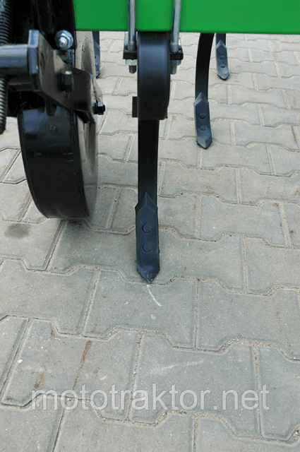 Культиваторы комплектуются двумя металлическими опорными колесами, которыми регулируется глубина обработки почвы. Стойки (лапы) культиватора крепятся на раме в 2 ряда на расстоянии 145 мм, узкие пружинные лапы могут быть замена на более широкие .