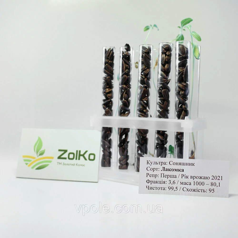 Раннеспелый крупноплодный кондитерский сорт подсолнечника Лакомка выведен из кондитерского сорта СПК методом многократного индивидуального отбора с последующим направленным на переопылением лучших по устойчивости к волчку биотипов.