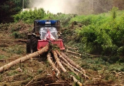 Принцип работы: трактор задним ходом подъезжает к удобному месту для стоянки, тракторист при помощи гидросистемы трактора опускает корпус лебедки до упора в землю, включает вал отбора мощности трактора, ослабляет ленточный тормоз барабана с помощью соответствующей кнопки на пульте управления. Чокеровщик разматывает трос на необходимую длину и чокеруют хлысты цепями. По сигналу чокеровщика тракторист включает муфту барабана лебедки с помощью соответствующей кнопки на пульте управления и подтаскивает хлысты до упора их в трелевочный щит лебедки. После этого он выключает муфту, поднимает трелевочный щит лебедки и осуществляет транспортировку хлыстов к месту разгрузки. Прибыв на место разгрузки тракторист отключает ленточный тормоз барабана и опускает хлысты на землю, чокеровщик отцепляет хлысты. Затем освободившийся трос наматывают на барабан и с помощью щита лебедки осуществляет штабилировку хлыстов. Цикл работ повторяется.