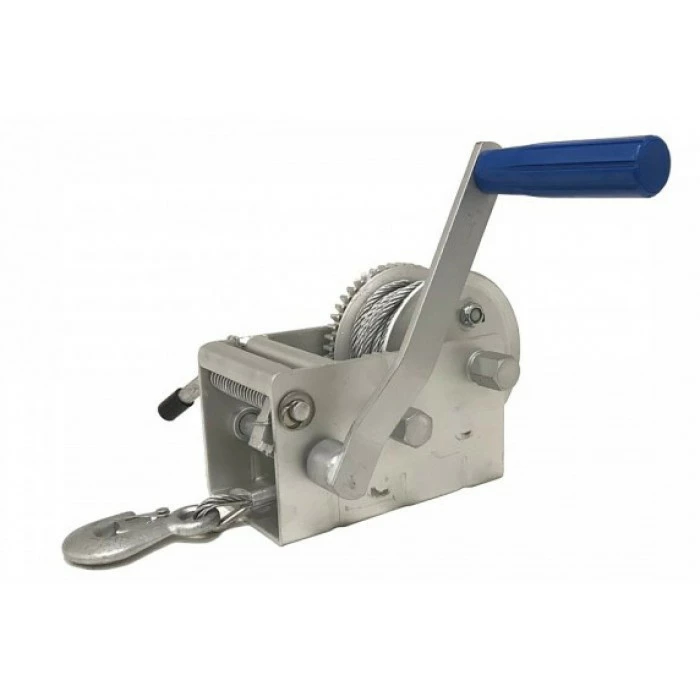 Максимальная нагрузка на данную лебедку составляет 1500 кг. Главной составляющей частью конструкции есть фрикционно-трещоточный (двухсторонний) тормоз, который поможет надежно зафиксировать транспортируемый объект в нужном положении на длительное время. Также, в комплектацию входит крюк с предохранителем и сверхпрочный 8-метровый стальной трос, диаметром 5,5 м.