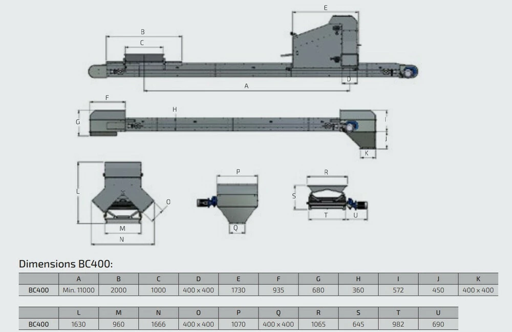 Тип ленточного конвейера BC400 состоит из стандартных элементов, которые при правильном объединении могут быть легко включены в любую систему транспортировки зерна.