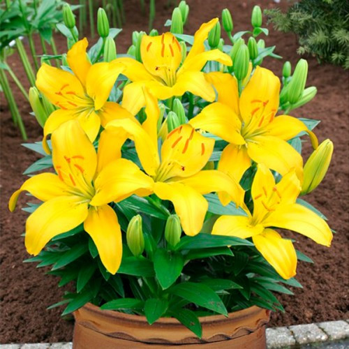 Лилия низкорослая Rio de Janeiro 12/14 — сияние тропического солнца на изумрудной листве. Ярко-желтые крупные цветы на компактных кустиках выглядят очень празднично. Аромат лилии Рио-де-Жанейро очень нежный и дополняет красоту соцветий. Низкорослость и неприхотливость позволяют выращивать эту красотку не только в саду, но и на подоконнике. И конечно же, из нее выходят изумительные букеты, которые будут уместны на любое торжество. В срезе желтые лилии остаются свежими до 14 дней.