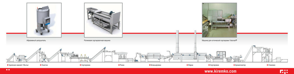 Линии начинаются с участка приема картофеля, который загружается, моется и осторожно отделяется от камней. Затем картофель легко очищается при помощи одной из нескольких техник в зависимости от затрат и мощности. После этого продукт разрезается, моется и иногда бланшируется для получения ломтиков, которые затем поступают в обжарочный аппарат, где и получаются отличные картофельные чипсы. Kiremko предлагает интегрированные решения по вкусовым добавкам и упаковке, что доказывает ее статус, как единственной компании в мире, способной предоставить полный пакет решений.