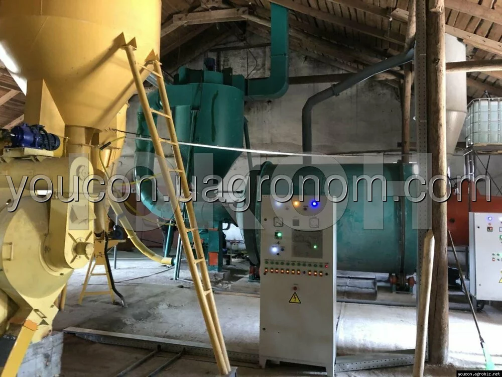Продукт, предназначенный для гранулирования, подается в бункер накопитель пневмотранспортом и разгрузкой с помощью цыклонов. Измельченное сырье постапает в бункер с помощью наклонного шнека. В бункере для исключения зависания продукта и образования сводов установлен ворушитель с постоянно включенным приводом. Дозатор бункера равномерно подает продукт в смеситель гранулятора, где он может увлажняться водой или паром и интенсивно перемешивается мешалкой смесителя (влага в необходимом количестве способствует образованию прочных и качественных гранул).