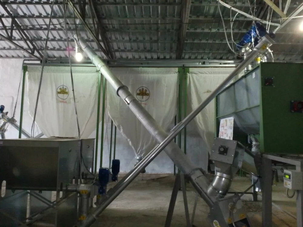 Измельченное зерно, шрот, подаются в накопительные бункера, устанавливаемые перед смесителем: 3 бункера по 6,5 м³ и два по 4,1 м³, которые заполняются лотковым шнеком TS 2003 (1,5 кВт) в комплекте с электро-задвижками. Накопительные силоса оснащены датчиками верхнего и нижнего уровней, что позволяет автоматизировать процесс их наполнения и, при срабатывании нижнего датчика (датчик запроса продукта, который устанавливается приблизительно по центру силоса), дозагрузки соответствующим продуктом. Это позволяет автоматически поддерживать уровень продукта в накопительных бункерах и обеспечивать, таким образом, бесперебойную работу смесительного блока.