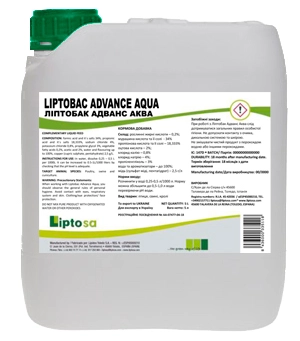 Ліптобак Адванс Аква – кормова добавка, яка є допоміжним засобом, який призначений для зниження рівня патогенної мікрофлори у воді для напування і кормах для свиней і сільськогосподарської птиці. Має бактерицидний ефект проти бактерій Gram - (E. Coli, Salmonella та ін.) та Gram + (Clostridium тощо), цвілеві гриби та дріжджі. Препарат має синергетичний ефект з антибіотиками. Це покращує динаміку росту і поїдання корму, покращуючи шлункову цілісність.