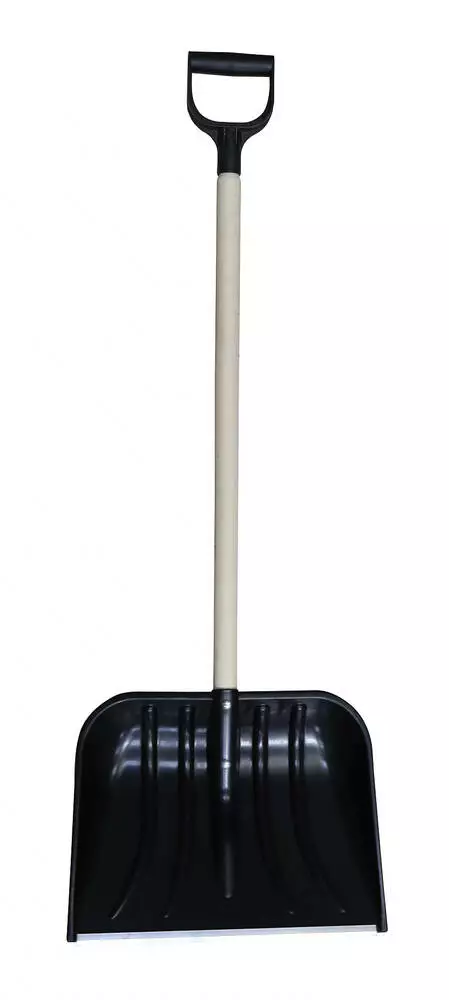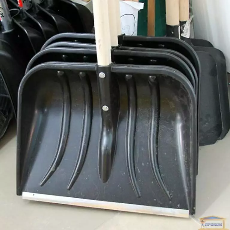 Лопата тротуарна снігоприбиральна пластмасова з дерев'яним держаком. Розмір ковша – 370х480 мм, глибина ковша – 50 мм. Ківш із міцного пластику, глибокий, вміщує велику кількість снігу. Робоча кромка посилена додатковою накладкою. Вона виготовлена ​​з алюмінієвого профілю і захищає ківш від пошкоджень при роботі з зледенілими доріжками. Товстий держак довжиною 1 м, діаметром 38 мм. Велика пластикова D-подібна ручка. Її розмір дозволяє працювати навіть у зимовій рукавичці. Лопата універсальна, може використовуватися для збирання зернових на елеваторах та струмах, а також збирання сміття в літній період.