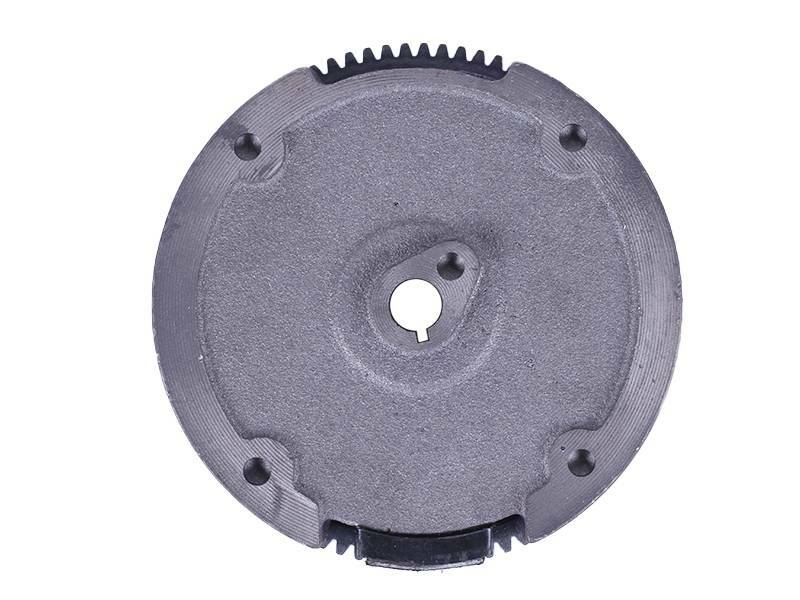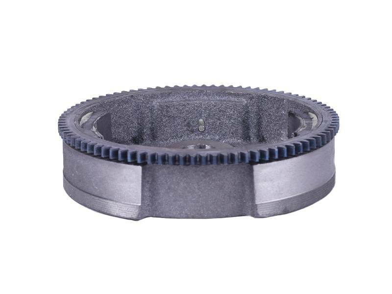 Маховик с венцом ТАТА на бензиновый двигатель 168F/170F генератора GN 2-3,5 KW, Z-86 является частью силового агрегата, выполняющей функции аккумулятора механической энергии. Благодаря большому весу деталь обладает значительным моментом инерции и способна накапливать и отдавать кинетическую энергию вращения. На внешней поверхности маховика расположен сальной венец, входящий в зацепление с бендексом электростартера и позволяющий запускать ДВС простым поворотом ключа в замке зажигания.На внутренней стороне маховика расположены постоянные магниты, являющиеся частью электрогенератора, предназначенного для питания сопуствующих электроприборов и заряда бортового аккумулятора.