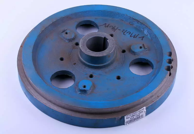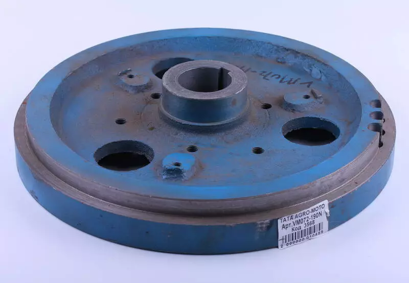 Маховик ТАТА 190N с проточкой под венец – это часть кривошипно-шатунного механизма, системы сцепления и системы запуска двигателя. Маховик ТАТА 190N задействован в качестве накопителя кинетической энергии или для создания инерционного момента. Наличие венца под бендикс позволяет установить электростартер. Отвечает за передачу крутящего момента от силового агрегата и стартера, вводит поршни из НМТ, ВМТ, демпферирует крутильные колебания и придает равномерность вращению коленчатого вала. Маховик 190N подходит на дизельные двигатели мотоблоков и мототракторов мощностью 10 л.с. с водяным охлаждением. Материал корпусам детали – чугун.