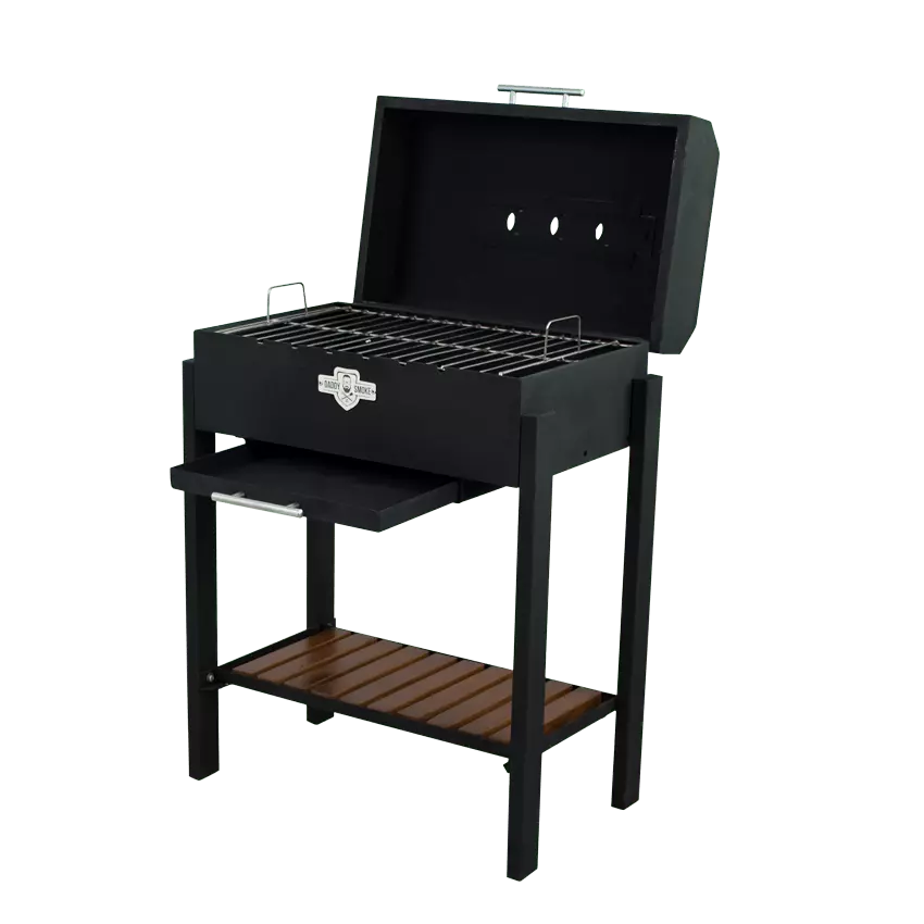 Данная модель изготовлена из высококачественной стали толщиной 3 мм, покрытой жаростойкой краской. По бокам расположены две удобные полки для специй,посуды,продуктов к приготовлению. Внизу есть полка для инвентаря. Очень важно, чтобы в момент приготовления всё было под рукой, и ничего не отвлекало Вас от создания кулинарного шедевра. Конструкция оснащена выдвижным зольником, который очень легко чистить. Для удобства транспортировки предусмотрены колеса и ручка на одной из полок.