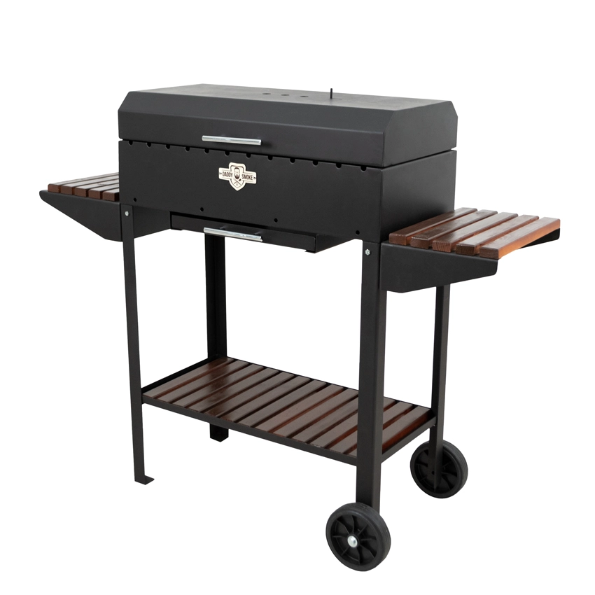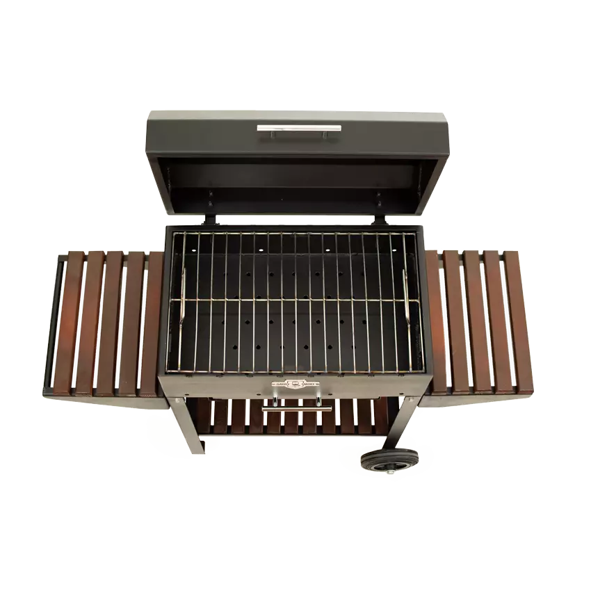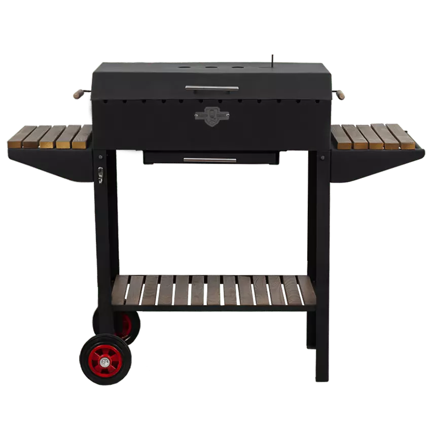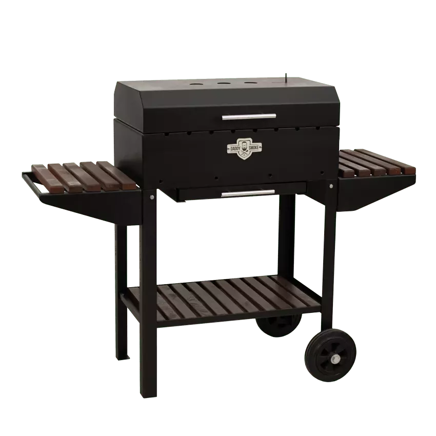 Данная модель изготовлена из высококачественной стали толщиной 3 мм, покрытой жаростойкой краской. По бокам расположены две удобные полки для специй,посуды,продуктов к приготовлению. Внизу есть полка для инвентаря. Очень важно, чтобы в момент приготовления всё было под рукой, и ничего не отвлекало Вас от создания кулинарного шедевра. Конструкция оснащена выдвижным зольником, который очень легко чистить. Для удобства транспортировки предусмотрены колеса и ручка на одной из полок.