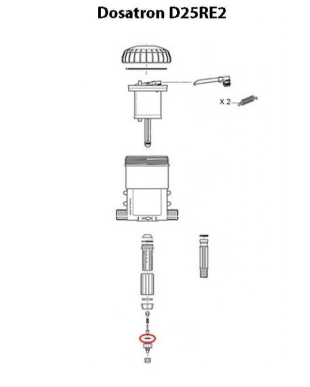 J051 Указанное манжетное уплотнение расположено в нижней части дозатора Dosatron D25RE2 между клапаном и нижним адаптером 1/4". На фото 2 красный эллипс обозначает расположение манжетного уплотнителя D25RE2 внутри дозатора.