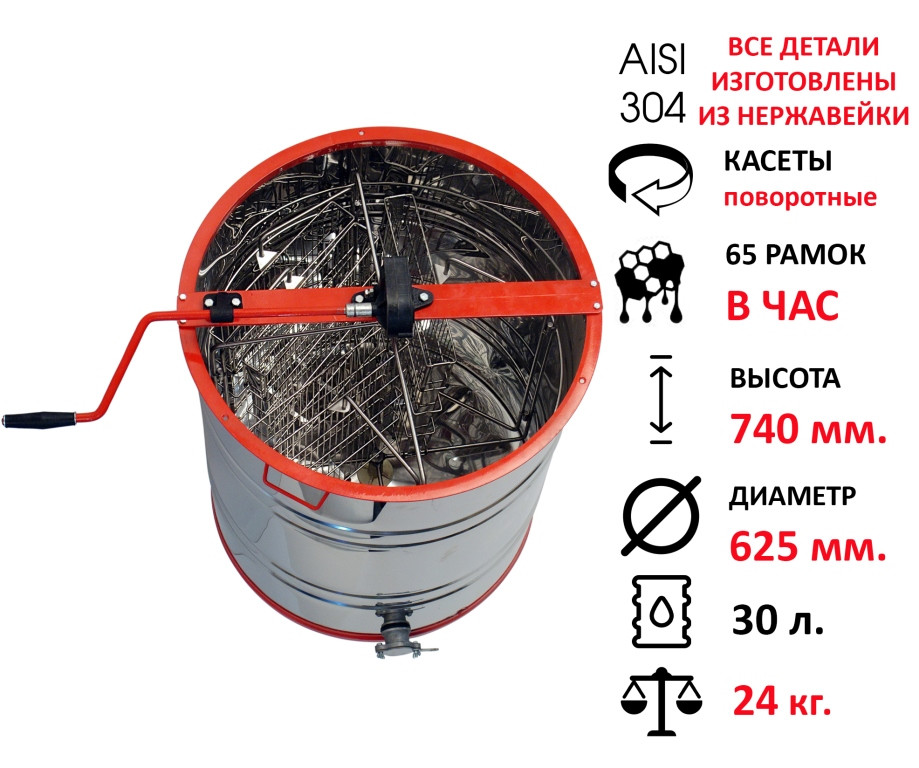 Медогонка 4-х рамочная поворотная из нержавеющей стали — это высокопроизводительное оборудование, полностью изготовленное из нержавеющей стали, включая бак, ротор и кассеты. Это делает её крайне надежной, устойчивой к коррозии и долговечной, что особенно важно при интенсивной работе на пасеке.