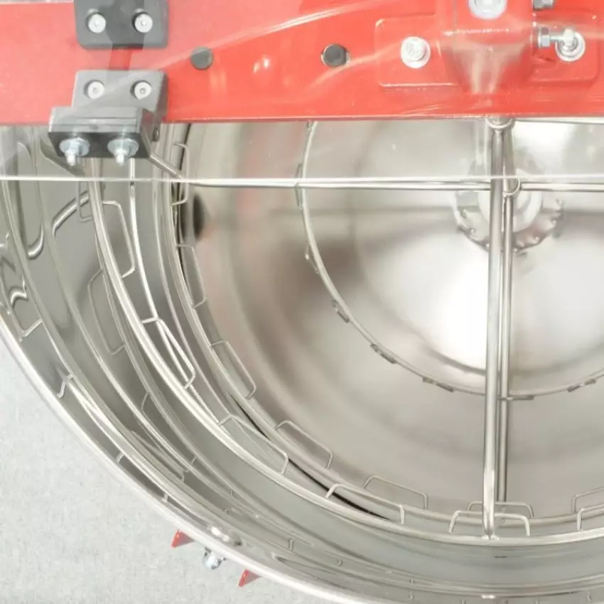 Крышка прозрачная изготовлена ​​из органического стекла. Это позволяет наблюдать за работой медогонки, не открывая ее. Крышка защищает медогонку от пчел, пыли и от попадания внутрь посторонних предметов при вращении медогонки.