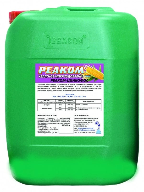 РЕАКОМ-ПЛЮС-ЦИНКОФОС - хелатная композиция, содержащая в одном концентрированном растворе макроэлемент фосфор в виде фосфиты (РО3) и фосфонатов, а также микроэлементы - цинк, железо, медь, которая служат для внекорневой подкормки растений в периоды активного развития корневой системы растения.