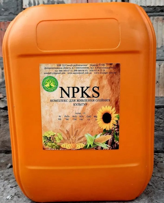 Улучшенный комплекс для питания масличных культур – "NPKS" с содержанием азота, фосфора, калия, серы, марганца и цинка, что способствует повышению урожайности и качественных показателей зерна.