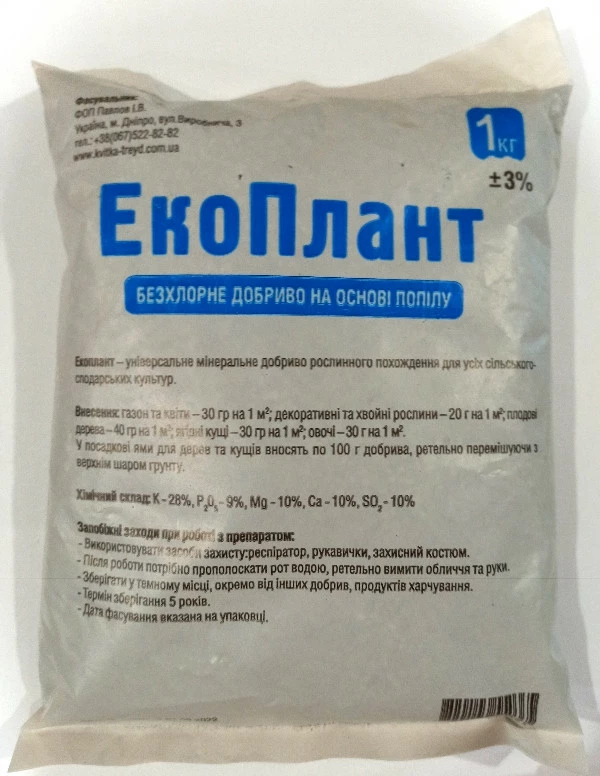 ЭкоПлант - одно из немногих калийных удобрений для растений, которое можно применять на овощных и ягодных культурах без риска получить угнетение хлором. Удобрение можно применять для осенней подкормки газонов, деревьев, винограда, ягодников, кустов роз и других многолетних цветов, для основного внесения под озимые культуры, а также весной под кукурузу, сою, подсолнечник, овощные культуры (картофель, свекла, капуста, морковь...). Обладает пролонгированным воздействием, не вымывается из пахотного слоя. Может быть альтернативой традиционным калийным (калий хлористый, сульфат калия, моносульфат калия, калийная соль, каинит, сильвинит...), калийно-магниевым (Калимаг, калимагнезия) и кальциевым (известь, известковая мука, доломит ...) удобрениям. ЭкоПлант подходит для использования в органическом земледелии (соответственно сертифицировано). Применяется и как осенняя, весенняя подкормка и как удобрение при посадке.