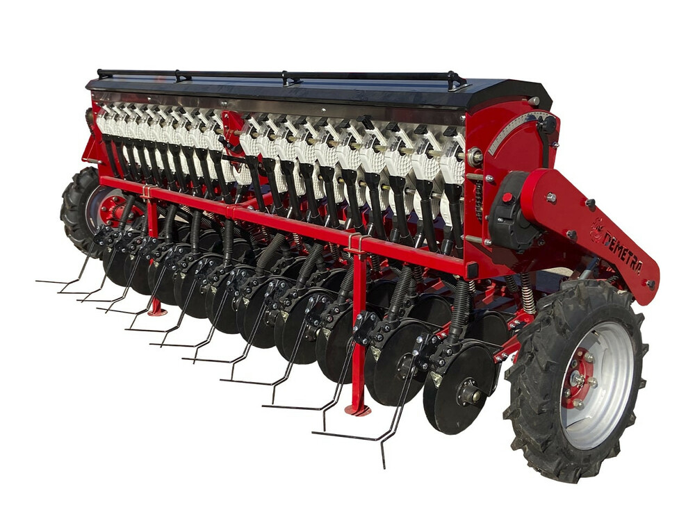 Навесная сеялка Деметра предназначена для посева зерновых, бобовых и мелкосемянных культур с одновременным внесением минеральных удобрений при агрегатировании с тракторами малого тягового класса (минитрактор, мототрактор).