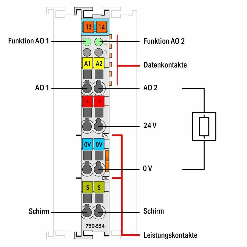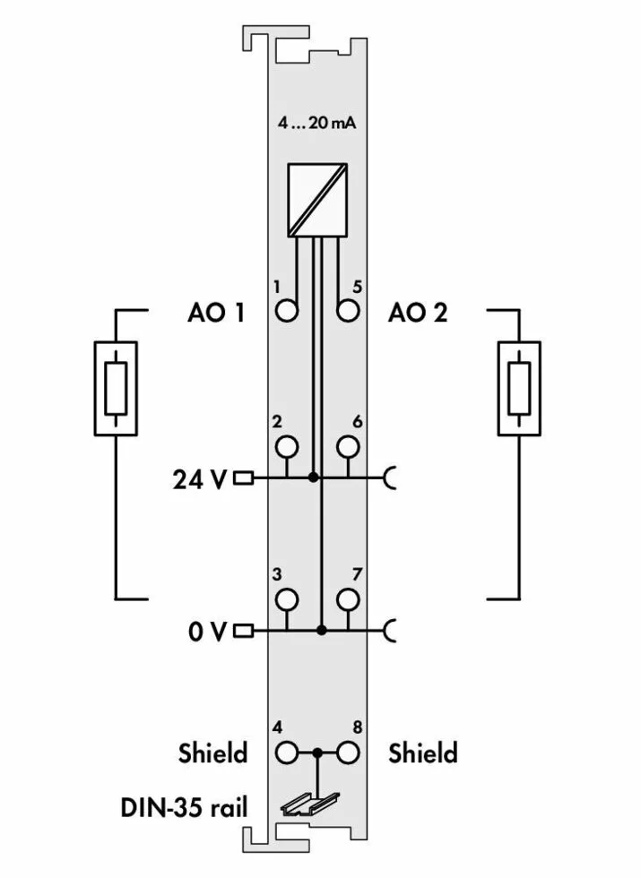 Модуль аналогово вывода WAGO 2-канальный; 4 – 20 мА. Генерирует сигналы со стандартным значением.