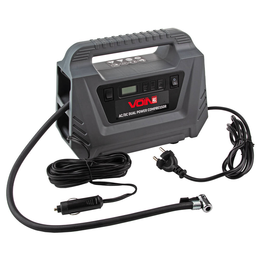 Компресор автомобільний "VOIN" VC-220 150psi/10А/25л/AC /DC/Автостоп (VC-220 AC /DC) — це потужний та універсальний компресор, який підходить для підкачування шин автомобілів (до R16), мотоциклів, велосипедів та інших надувних виробів. Завдяки надійному двигуну та компактному сучасному корпусу, пристрій поєднує високу продуктивність із зручністю використання як вдома, так і в дорозі.