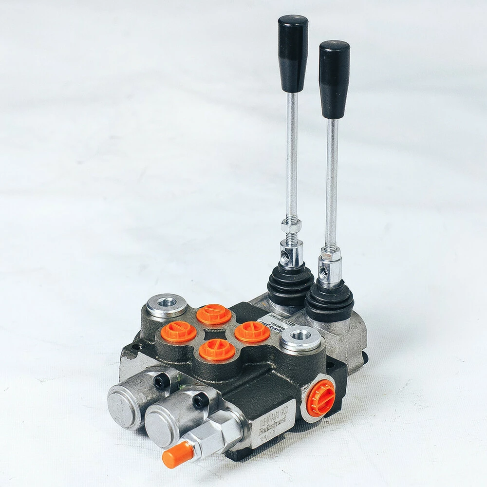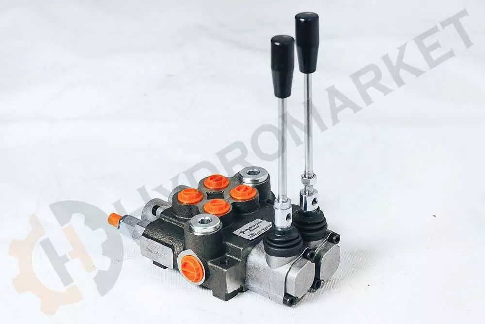 Моноблочный гидравлический распределитель - дивертор 2Р40 с ручным или механическим управлением, предназначен для изменения направления потока и ограничения давления рабочей жидкости в гидравлических линиях, разгрузки насоса в нейтральной позиции золотников. Золотники при помощи рукоятки управляют потоком жидкости. Моноблочные распределители 2Р40 с ручным управлением золотниками, имеют один общий литой корпус с размещенными в нем параллельно друг другу золотниками (возможное количество золотников от 1 до 7) и предохранительным клапаном. Корпус изготовлен из серого чугуна СЧ30. Золотники гидравлического распределителя установлены в корпусе, что позволяет оптимизировать габариты и массу распределителя под требуемый тип машин.