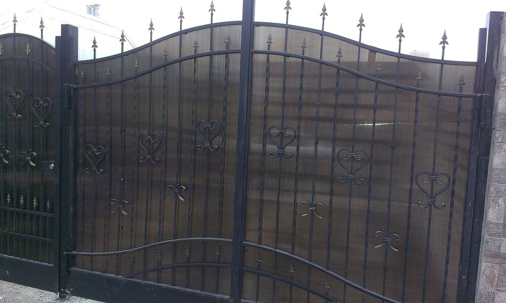 Ворота из поликарбоната имеют свои преимущества. Как правило, такие ворота изготавливаются как отделка кованых ворот - поликарбонат позволяет скрыть ваш двор от посторонних глаз. Кроме того, поликарбонат имеет множество преимуществ: