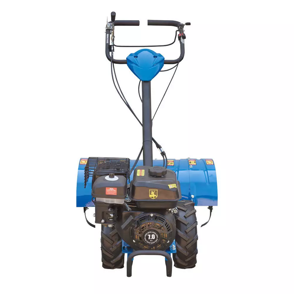 Зниження навантаження відбувається завдяки компоновці, характерній для набагато потужніших професійних машин, а саме − роторна ґрунтофреза винесена назад і приводиться в дію через окремий редуктор. У свою чергу, поступальний рух усього агрегату вперед або назад здійснюється завдяки ведучим колесам із шевронним протектором «ялинка».