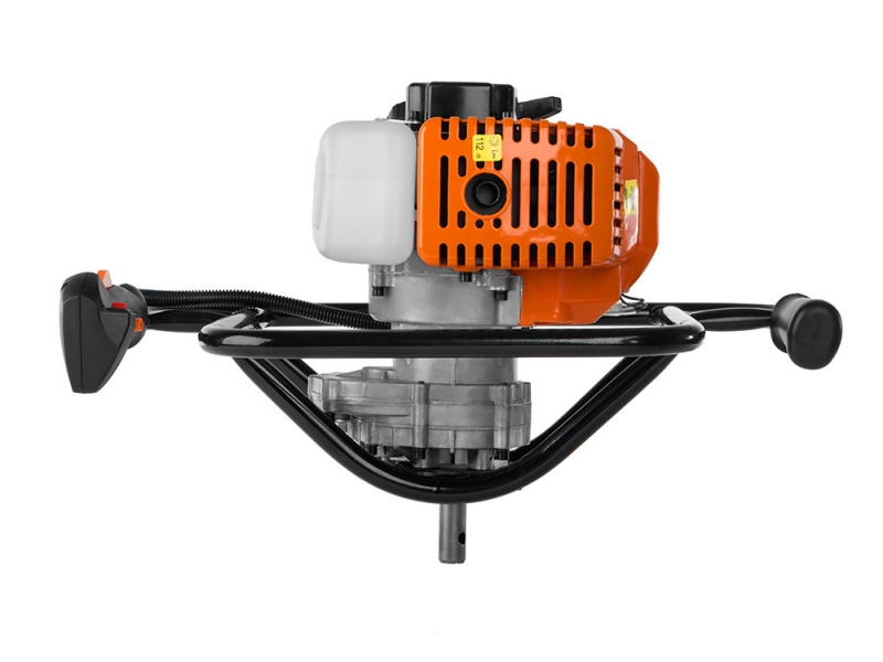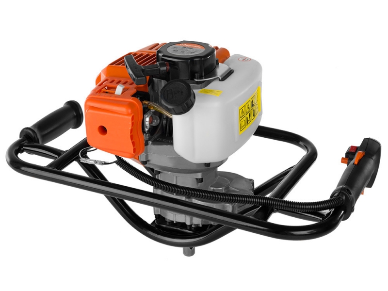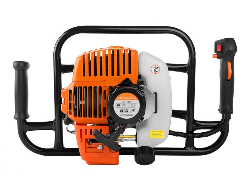Мотобур бензиновий Енергомаш МБ-1552 є моторизованим механічним пристроєм для буріння отворів різного діаметра і глибини в грунті під посадку дерев, встановлення стовпів, опор огорож, напрямних труб при будівництві парканів. Обертання бура (шнека) здійснюється через редуктор надійним одноциліндровим двотактним двигуном з повітряним охолодженням. Економічний двигун об'ємом 52 см³ та потужністю 2,5 к.с працює на суміші бензину АІ-92 з олією для двотактних двигунів. Її готують безпосередньо перед застосуванням і заливають у бак 1,2л. Запускається двигун ручним стартером. Оберти двигуна регулюються важелем дросельної заслінки (ручка газу), розташованої на ручці оператора. Максимальна швидкість обертання шнека 280 об / хв. Зручна ергономічна ручка оператора.