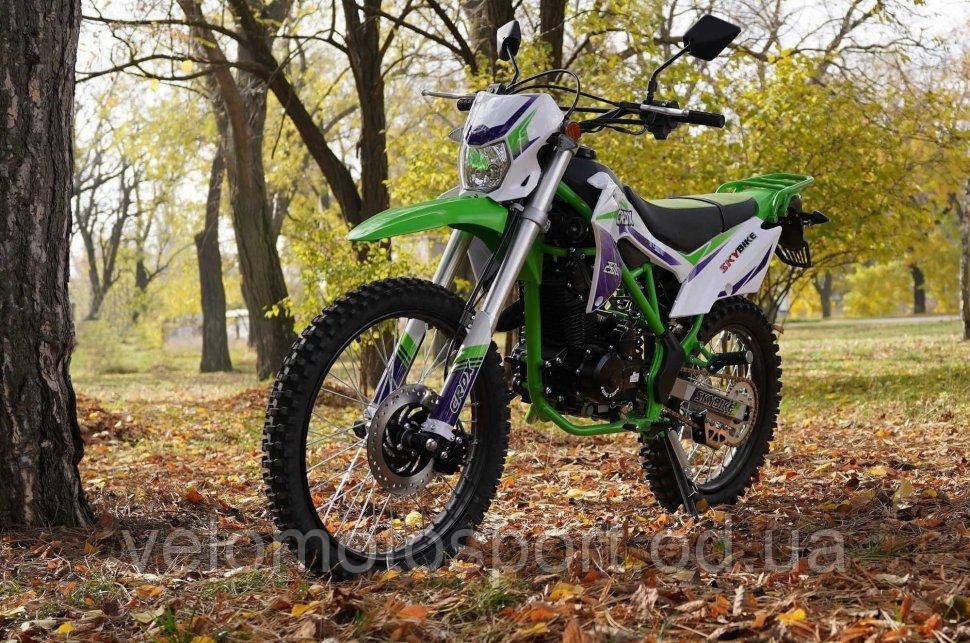 Телефоны для заказов : 093-100-95-92;068-551-71-04;095-758-06-52; Мотоцикл SKYBIKE CRDX 250 - представлен на внедорожной полноразмерной резине YUANXING в данный момент в зелено-белой расцветке, сразу бросающейся в глаза прохожим. Выхлопная труба выдает басовитый приятный звук. В обновленная версия мотоцикла CRDX 250 отличается в первую очередь более мощным двигателем CB-250 с верхним распредвалом производства компании ZONGSHEN ZS169FMM, объемом 223 куб.см. Расход топлива в эконом режиме чуть больше 3-х литров на 100 километров пути. Пластиковый топливный бак остался без изменений, ёмкостью 6,5 л. Достаточно большой клиренс, небольшой собственный вес и небольшая высота посадки этого эндурика позволяет с удобством разместиться на нем людям невысокого роста и женщинам, желающим составить компанию своим друзьям – мотоциклистам. ТЕХНИЧЕСКИЕ ХАРАКТЕРИСТИКИ: