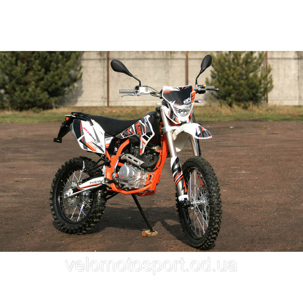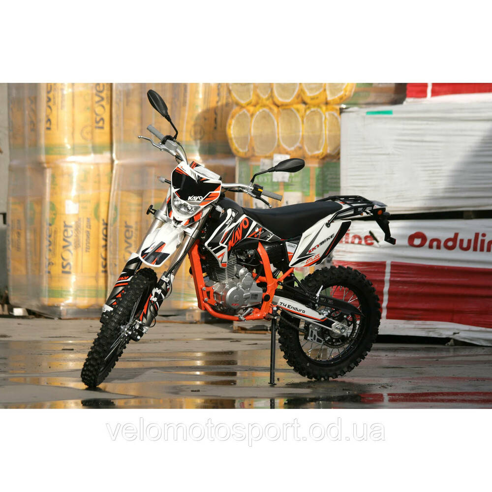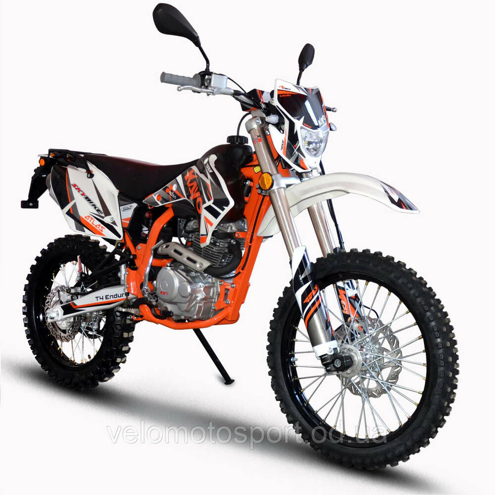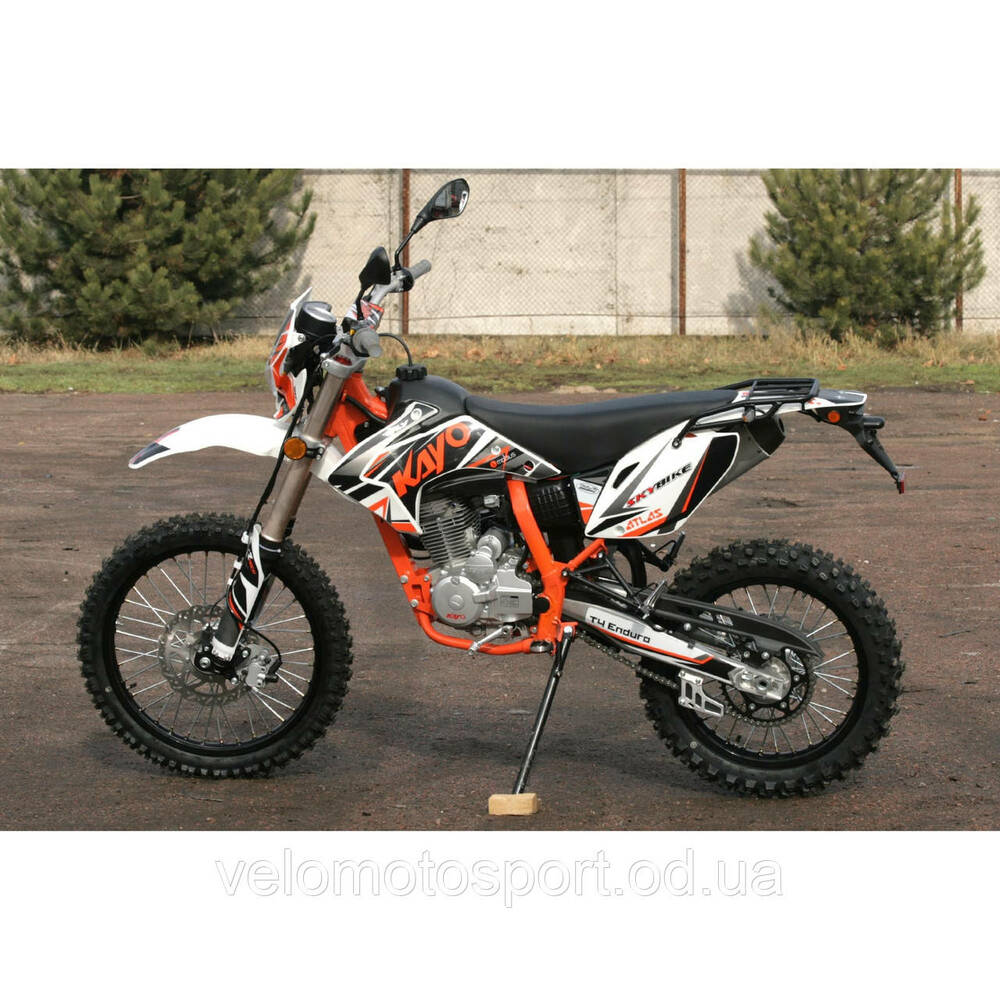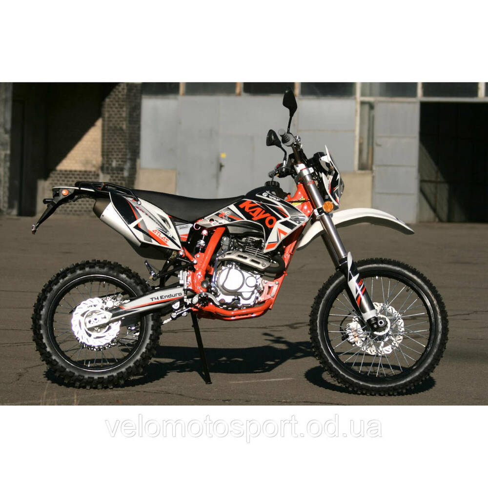 Мотоцикл Skybike KAYO T4-250 куб. - На мотоцикле установлен 1 цилиндровый, 4-х тактный двигатель воздушного охлаждения с верхним распредвалом, мощностью 16,4 л.с. при 7000 об.мин., объемом 223 см.куб. Модернизация коснулась в первую очередь несущей рамы мотоцикла. Топливная смесь подается с помощью карбюратора, зажигание электронное. Передняя вилка перевернутого типа длиной 880 мм (в отличии от 800 мм на T2), с регулировками обратного хода пружины и компрессии, производства известной компании FAST ACE (кстати, большего диаметра, чем на T2), передний дисковый тормоз с двухпоршневым суппортом. Диск переднего тормоза шире, чем на T2, на 30 мм. Задняя подвеска выполнена на линке прогрессии с амортизатором длиной 450 мм., также производства компании FAST ACE, с регулировками степени демпфирования, обратного хода и передняя тяга пружины и газовой подкачкой. Задние дисковые тормоза, в отличие от T2, оснащены однопоршневым суппортом. Задний тормозной диск шире, чем на Т2 , на 20 мм. Коробка передач механическая, 5-ступенчатая, с международной схемой переключения передач. Приводная цепь 520-я, соотношение ведущей и задней звезды 13Т-45Т. ХАРАКТЕРИСТИКИ: