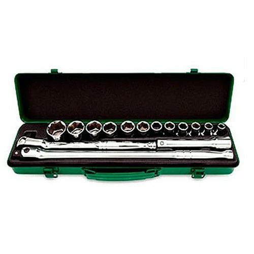 Набор включает в себя: 12 торцевых 6-гранных головок, удлинитель 125мм, вороток с шарниром 380мм и трещотка на 60 зубцов с металлической ручкой.