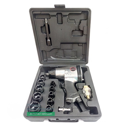 Набор содержит: гайковерт, 12 торцевых головок от 9 до 27мм, один удлинитель длиной 125мм. Все головки ударного типа. Изготовлены из прочной хром-молибденовой стали. Набор дополнительно комплектуется воздушным ниппелем, маслёнкой для хранения масла и мини-маслёнкой для подключения к гайковёрту.