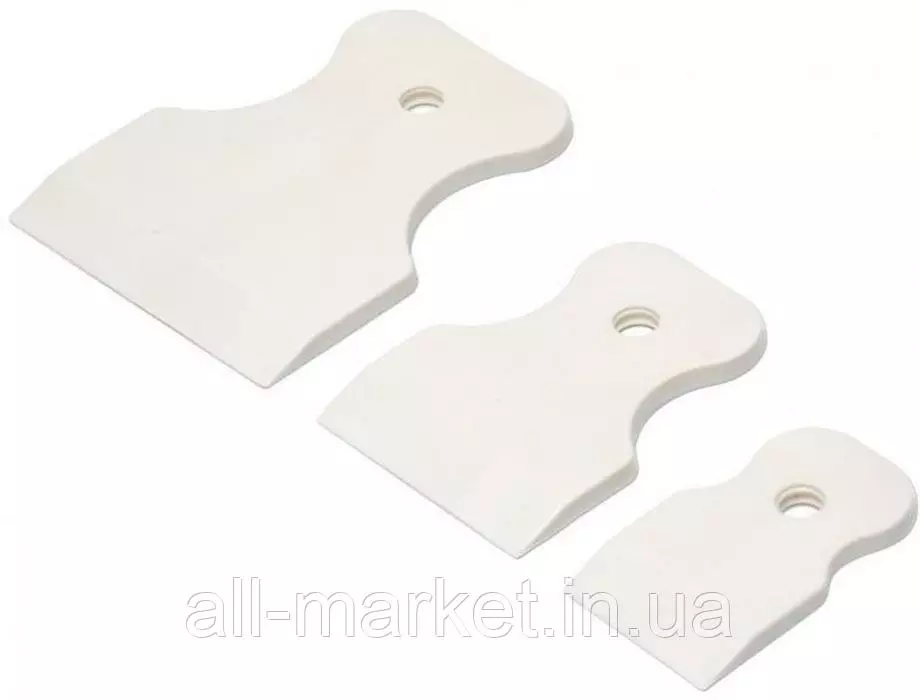 Набор шпателей изготовлен из резины. Маленький размер инструментов, прочность и гибкость позволяют с точностью наносить материал. Резиновые шпатели применяются для проведения финишных работ по нанесению шпаклевочного слоя на поверхности, затирки межплиточных швов