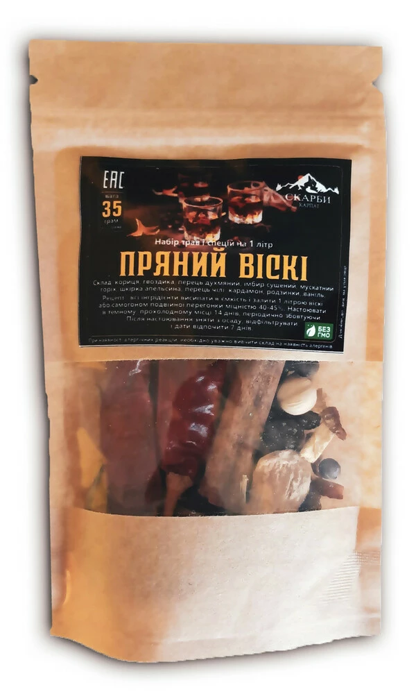 В состав набора трав и специй «Пряный виски» входят: корица, гвоздика, перец душистый, имбирь сушеный, мускатный орех, корка апельсина, перец чили, кардамон, ваниль, изюм.