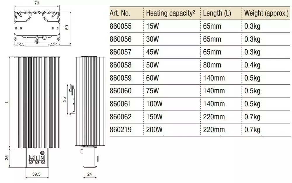 Эти нагреватели используются в корпусах, где необходимо предотвратить повреждение от конденсации или где температура не может упасть ниже минимального значения. Конструкция корпуса нагревателя из алюминиевого профиля имеет дымоходный эффект и равномерно распределяет тепло. Обогреватели предназначены для постоянной эксплуатации. Соединительные зажимы экономят время и упрощают монтаж
