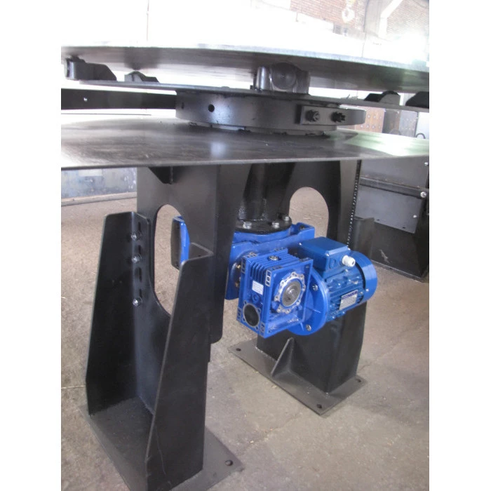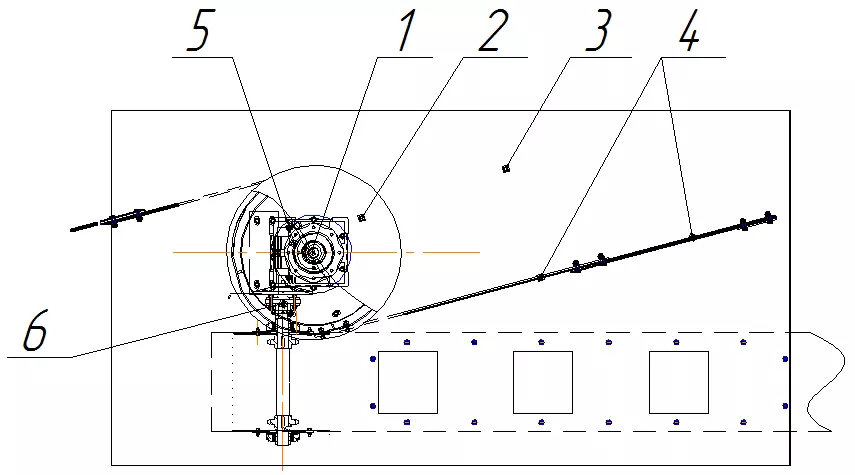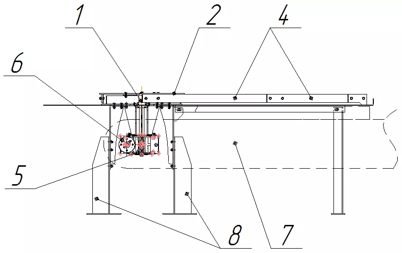 1. Вал мешалки; 2. Поворотный диск с разгрузочным диском; 3. Стол накидывателя; 4. Рессорные лопасти; 5. Редуктор червячный; 6. Срезная муфта; 7. Приемная секция скребкового транспортера; 8. Опорные стойки.