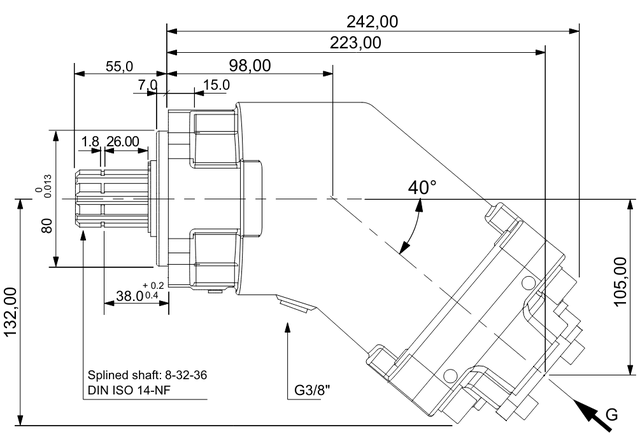Нерегулируемый аксиально-поршневой насос с наклонным блоком Hidrocel 2PBA правого вращения (за часовой стрелкой). Рабочий объем составляет 108 куб. см. Рассчитан на работу при номинальном давлении 350 бар и пиковом 400 бар. Шлицевой вал: 8-32-36 DIN ISO 14-NF.