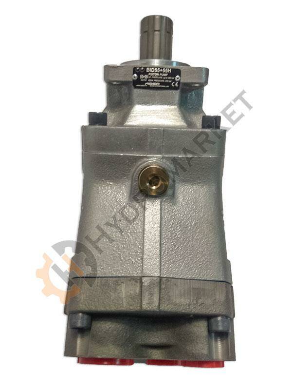 Нерегулируемый двухпоточный аксиально-поршневой насос с наклонным блоком Aber BID55+55HL левого вращения (CCW). Рабочий объем составляет 58 + 60 куб. см. Рассчитан на работу при номинальном давлении до 350 бар.