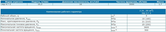 Насос НШ 4Г-3 самый малый из серийно выпускаемых объединением "Гидросила" ― цифра "4" в маркировке говорит об объеме насоса в 4,5 см3. Получается производительность НШ 4Г при оборотах приводного двигателя равна 4,5 л/мин. Цифра "3" обозначает исполнение насоса по давлению, т.е. номинальное давление НШ4Г равно 16 МПа.