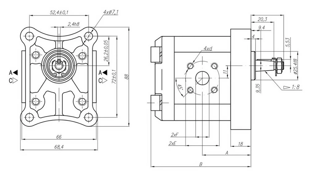 Насос импортный шестеренный I группы объемом 1,22 см3, 1,63 см3, 2,18 см3, 2,72 см3, 3,27 см3, 3,81 см3, 4,36 см3, 5,7 см3. Рабочее давление 120-175 Бар, максимальная скорость вращения - 3500 об/мин.