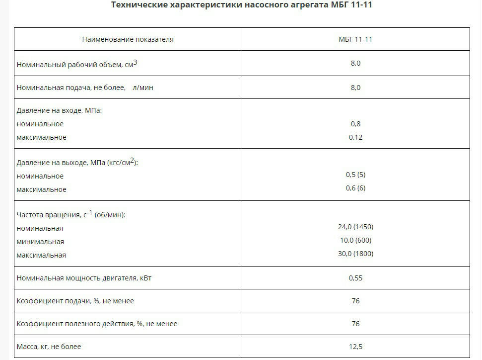 Насосный агрегат МБГ-11-11 используется для нагнетания минерального масла в гидравлические системы с постоянным номинальным давлением. Конструктивно состоит из: электродвигателя, шестеренного насоса и муфты, которая их соединяет.