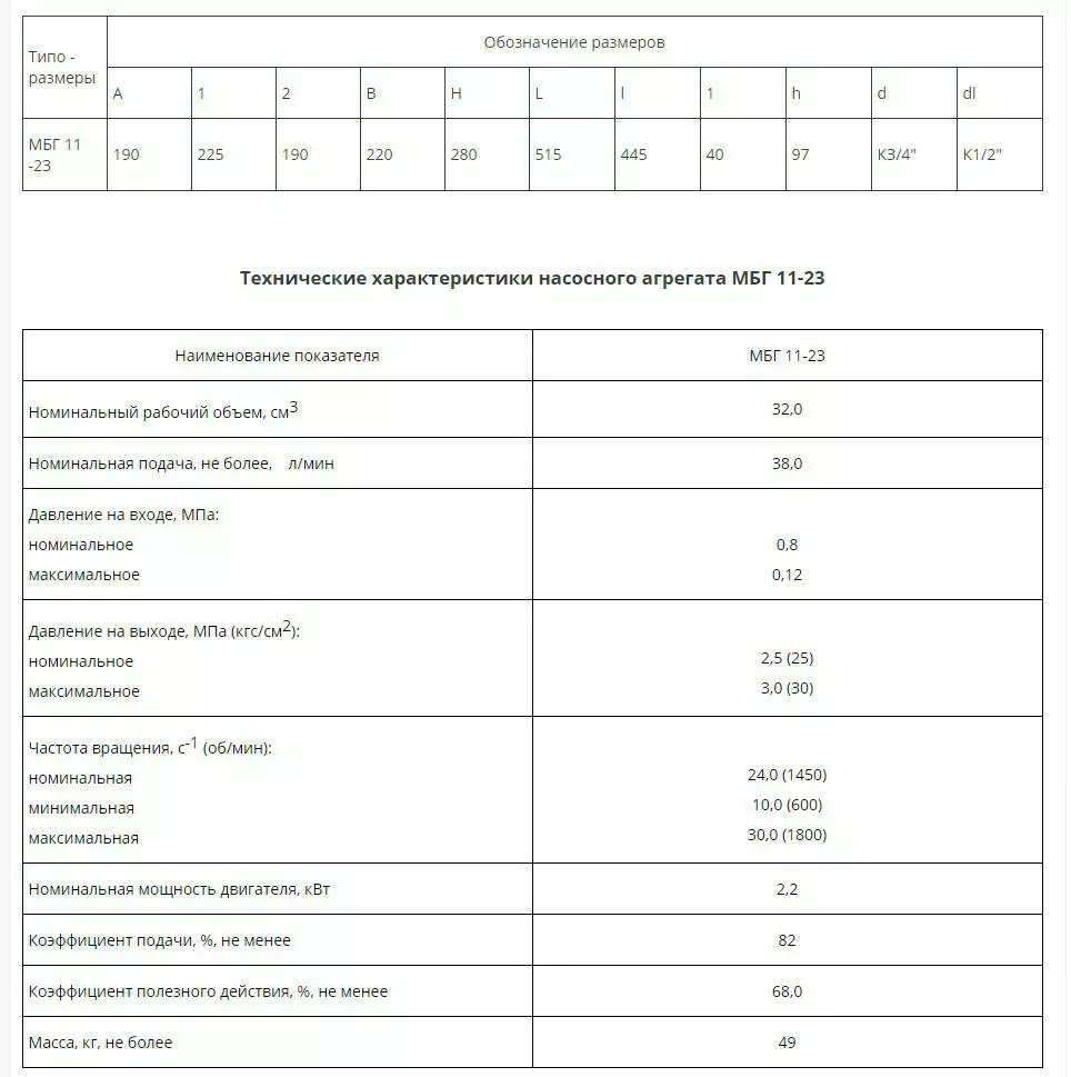 Агрегат насосный МБГ-11-23 имеет рабочий объем 32 см3 и может подавать до 38 литров жидкости за минуту. Состоит из электродвигателя и насоса (шестеренного). Жидкость не должна содержать примесей, способных вызвать коррозию у внутренних механизмов.