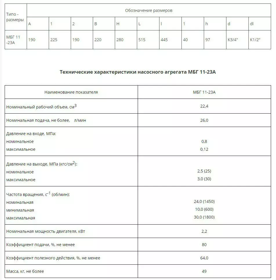 Агрегат МБГ-11-23А работает с жидкостью, тонкость очистки которой составляет 40 мкм, а вязкость в пределах от 17 до 400 мкм. Конструктивно состоит из двух основных частей: электродвигателя и шестеренного насоса. Электродвигатель имеет мощность 2,2 кВт.