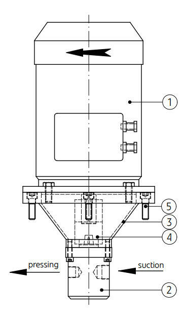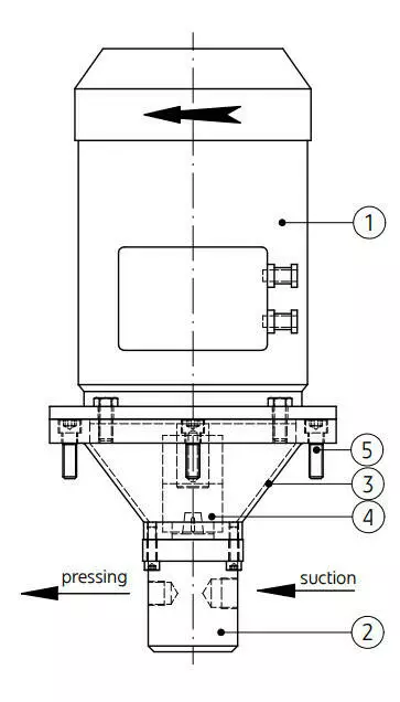 Тандемные насосы построены на основе редуктора насоса (2) с внешними зубчатыми колесами. Насосы (2) приводятся в движение асинхронными трехфазными двигателями (1) с помощью эластичных муфт(4). Основные элементы тандемных насосов