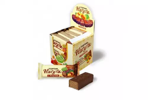 Пятнадцатислойный вафельный тортик в темной глазури и яркой индивидуальной упаковке со вкусом шоколада. В состав начинки входит натуральный фундук