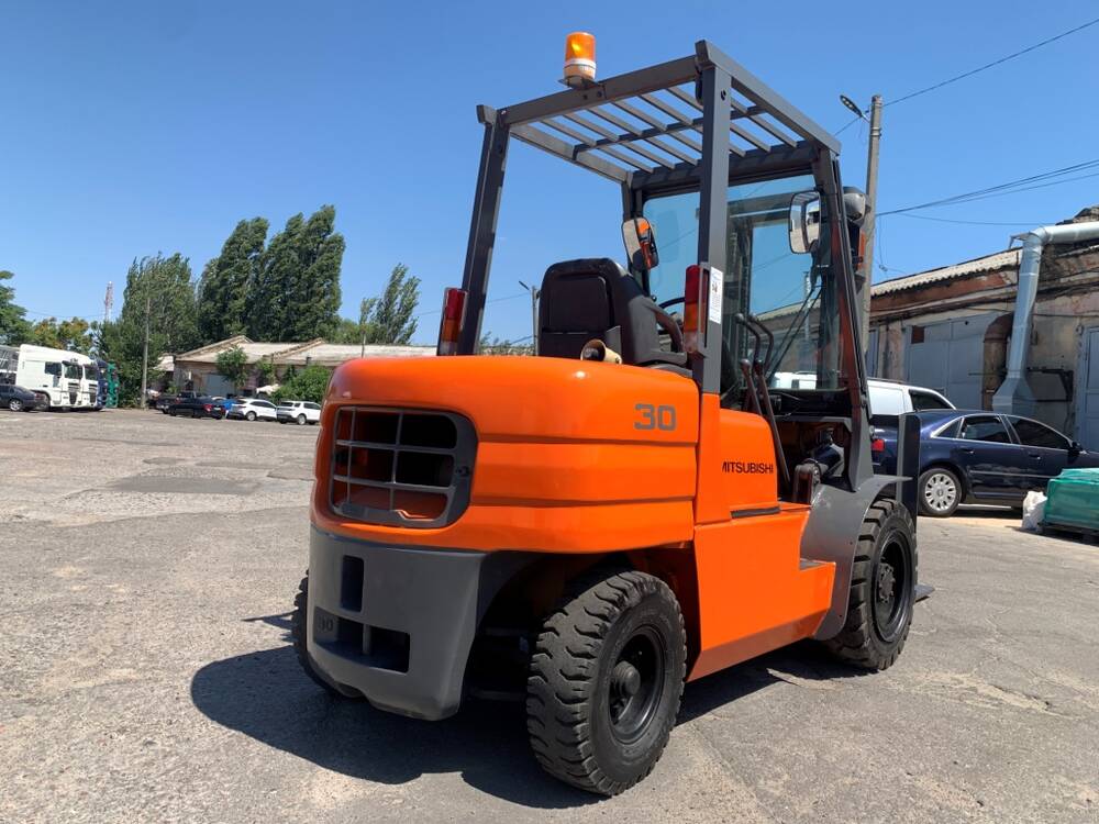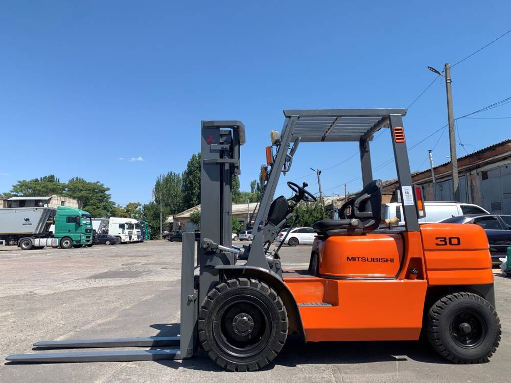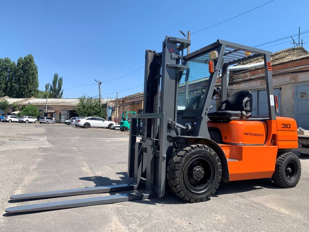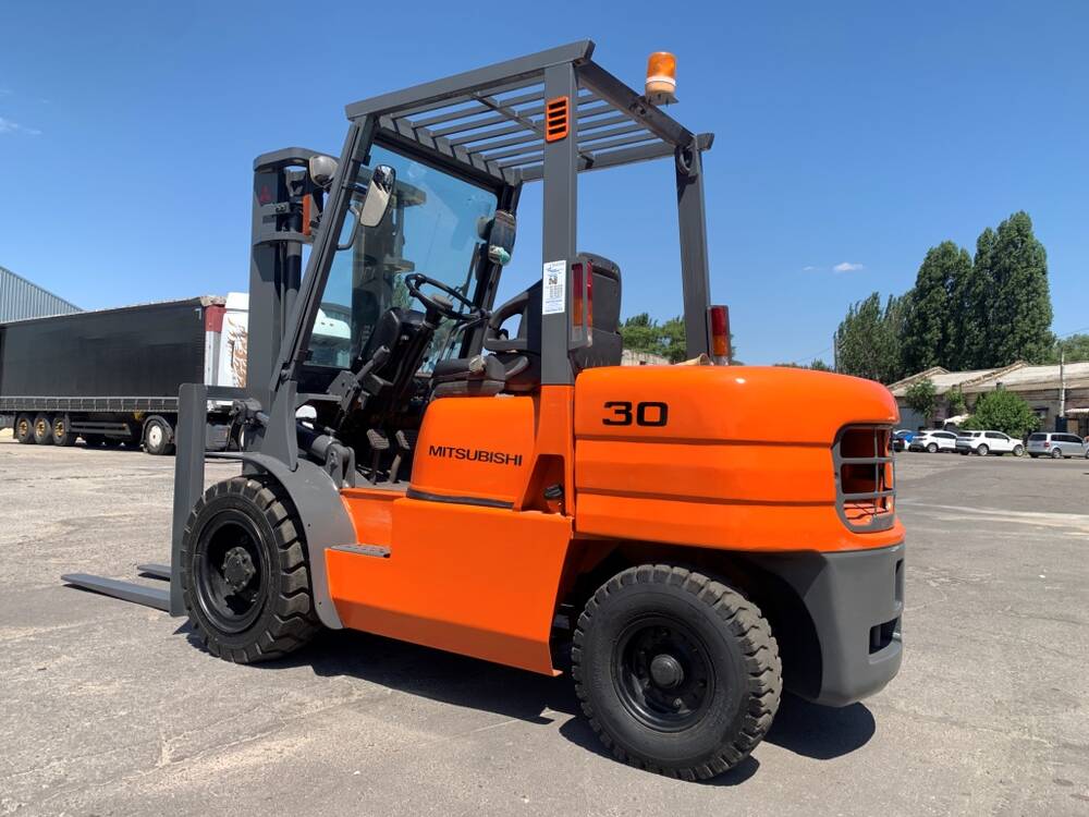 Навантажувач вилковий Mitsubishi на 15 великих нових колесах пневмо, з напрацюванням 6581 м/год. Модель: FG30 F13D. Вантажопідйомність 3 тонни. Максимальна висота підйому вантажу 3 метри. Габаритна висота 2.23 метри. Щогла двохсекційна (duplex) яка не втрачає вантажопідйомності при висоті підйому. Коробка передач проста механічна 2-ступінчаста. Обладнаний карбюраторним двигуном, який маловимогливий до якості палива і головне ремонтопридатний. Mitsubishi 4G64. 4-циліндровий, робочим об'ємом 2.4 літри і потужністю близько 50 к. с. який славиться своєю надійністю і невибагливістю (встановлювався на автомобілі Mitsubishi). Управління гідравлікою здійснюється простою і перевіреною часом системою-важелями. Колеса 15 діаметра на ведучiй осі, що покращує прохідність автонавантажувача і збільшує його кліренс. Вила 1.52 метри.