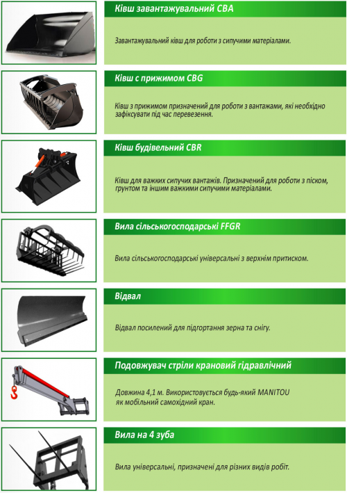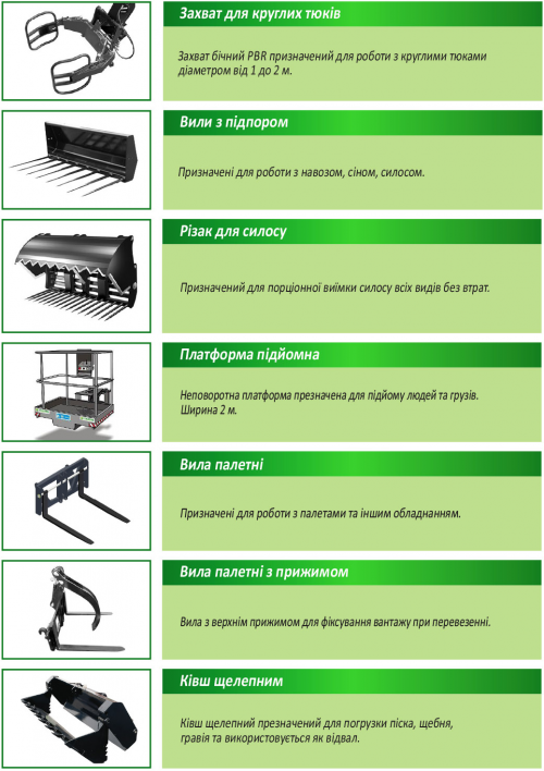 запасных зубьев к ним; Захваты для круглых тюков; Ковши с резаком