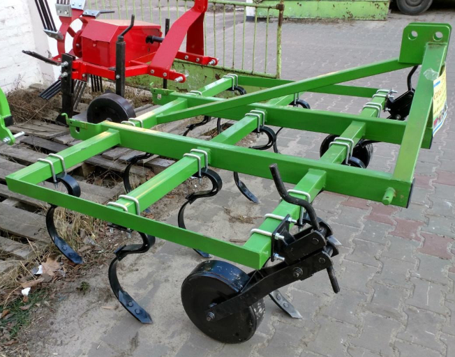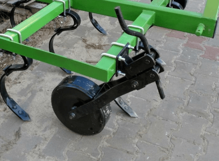 Стойки культиватора Бомет устанавливаются на раме, на расстоянии 100 мм с помощью крепежных накладок. Глубина культивации регулируется при помощи двух опорных колес.